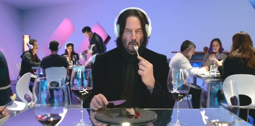 Reeves, hilariously tuned into and skewering his dual public personas of the soulful, abjectly kind contemplator (his name literally means ‘cool breeze over the mountains’) and that of his Neo, Wick-esque fight-ready machismo, his extended cameo is an absolute delight. Blending the two as he seamlessly transforms from an at least outwardly kind figure into a combative force, Reeves asking for a dish that plays with the concept of time and then weeping as the cries of the cow he is eating are played to him over headphones is pure, comedy, gold.