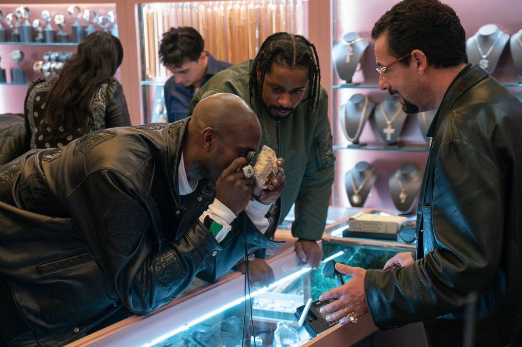 On this matter, it would be very easy for Sandler or the Safdie Brothers (whose Jewish father worked in New York’s gem district) to play more directly or land quick jokes off prominent stereotypes given the lead character’s profession. Instead, the film coyly dismisses racism by bare acknowledging the ubiquity of this trope, instead hilariously pivoting to more idiosyncratic, American-centric Jewish cultural touchstones or understandings to situate us in this world without perpetuating else. “What is it with you Jews and basketball?” is a particular highlight.